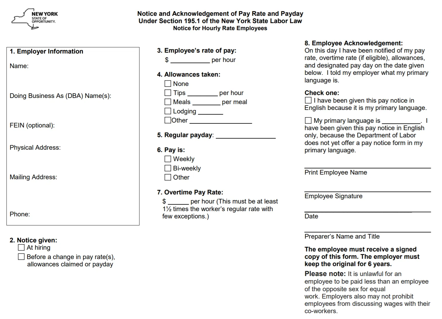 In New York State, as part of the Wage Theft Prevention Act, employers are